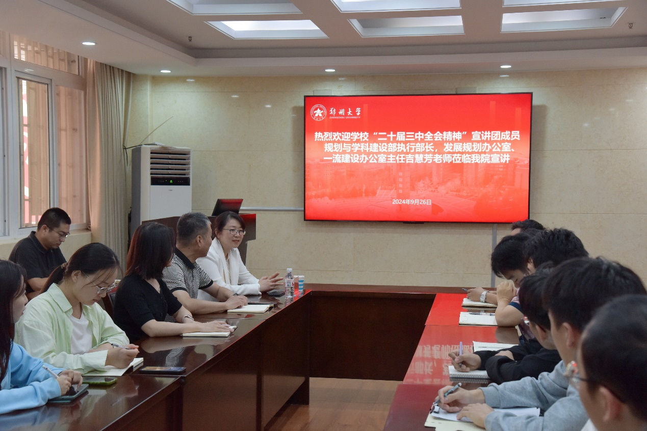 宣讲会上,吉慧芳以《学深走实助力一流》为题,结合学校实际工作,从深学细悟、把握精髓,强国建设、郑大何为,学科引领、资源支撑,凝心聚力、共建一流四个方面,对党的二十届三中全会中强调的教育、科技、人才在中国式现代化进程中的基础性、战略性支撑进行了系统阐述,她强调,全校师生要深入融合全国教育格局、河南省教育实际、学校发展态势及学科建设需求等多维度因素,以“全面覆盖、深入剖析”的宏阔视野,深刻领悟党的二十届三中全会精神在促进教育、科技、人才事业全方位、高质量发展中的核心引领作用。
