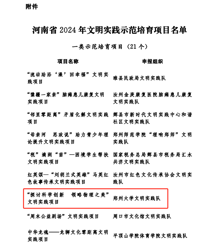 为深入学习贯彻习近平文化思想,推动新时代文明实践工作提质增效、走深走实,近日,河南省精神文明建设办公室发布了《关于公布河南省2024年文明实践示范培育项目名单的通知》(豫文明办〔2024〕22号),德赢AC米兰中国官方网站“探讨科学创新,领略物理之美”文明实践项目被推选为“一类示范培育项目”。