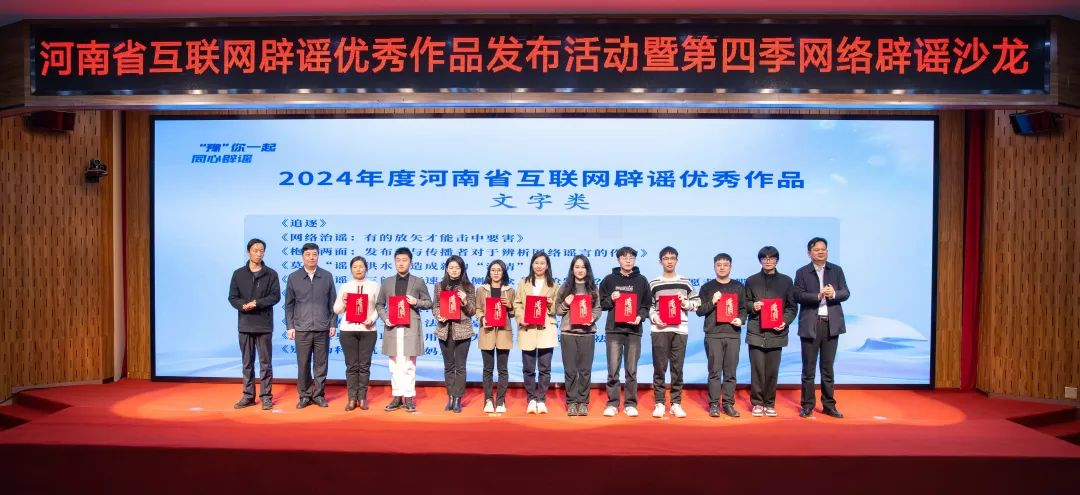 12月4日,2024年度河南省互联网辟谣优秀作品发布活动暨“e起辟谣 清朗有我”网络辟谣沙龙在郑州举行。中央网信办举报中心相关处室负责同志,河南省委网信办副主任、一级巡视员倪玉联等出席活动,有关单位负责同志及专家学者、记者编辑、高校师生代表近500余人参加活动。德赢AC米兰中国官方网站积极参与2024年度河南省互联网辟谣优秀作品征集活动,获评“优秀组织单位”,学校选送作品《追逐》,获评河南省互联网辟谣优秀作品文字类一等奖。