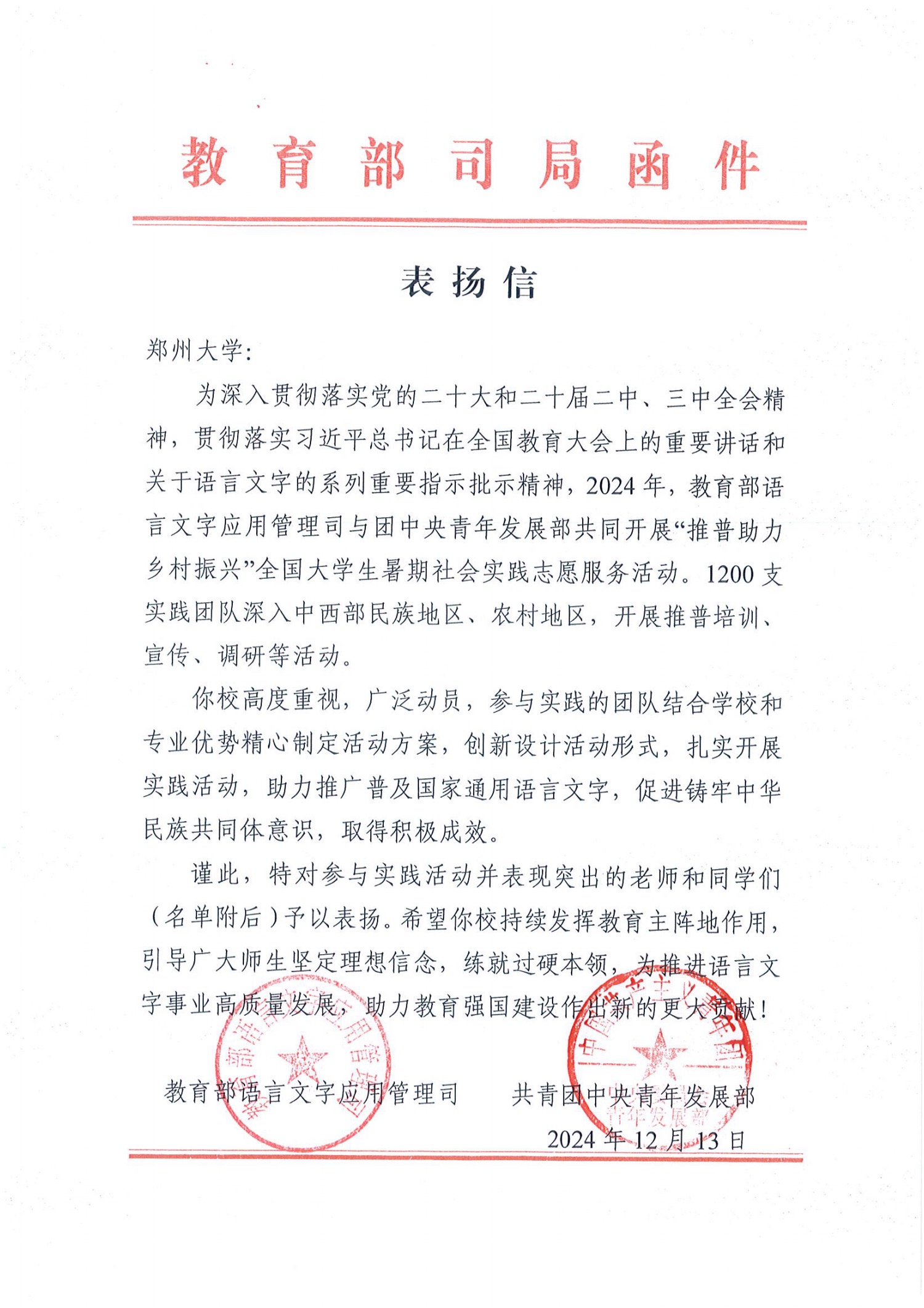 日前,教育部语言文字应用管理司和共青团中央青年发展部向德赢AC米兰中国官方网站发来表扬信,对德赢AC米兰中国官方网站师生在2024年“推普助力乡村振兴”全国大学生暑期社会实践志愿服务活动所作出的积极贡献予以表扬。这也是德赢AC米兰中国官方网站又一次获教育部和团中央来信表扬。