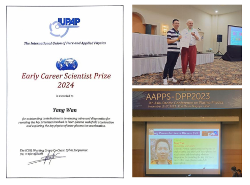 万阳教授先后荣获2023年度亚太物理学会等离子体物理大会青年科学家奖和2024年度国际纯粹与应用物理联合会超强激光青年科学家奖
