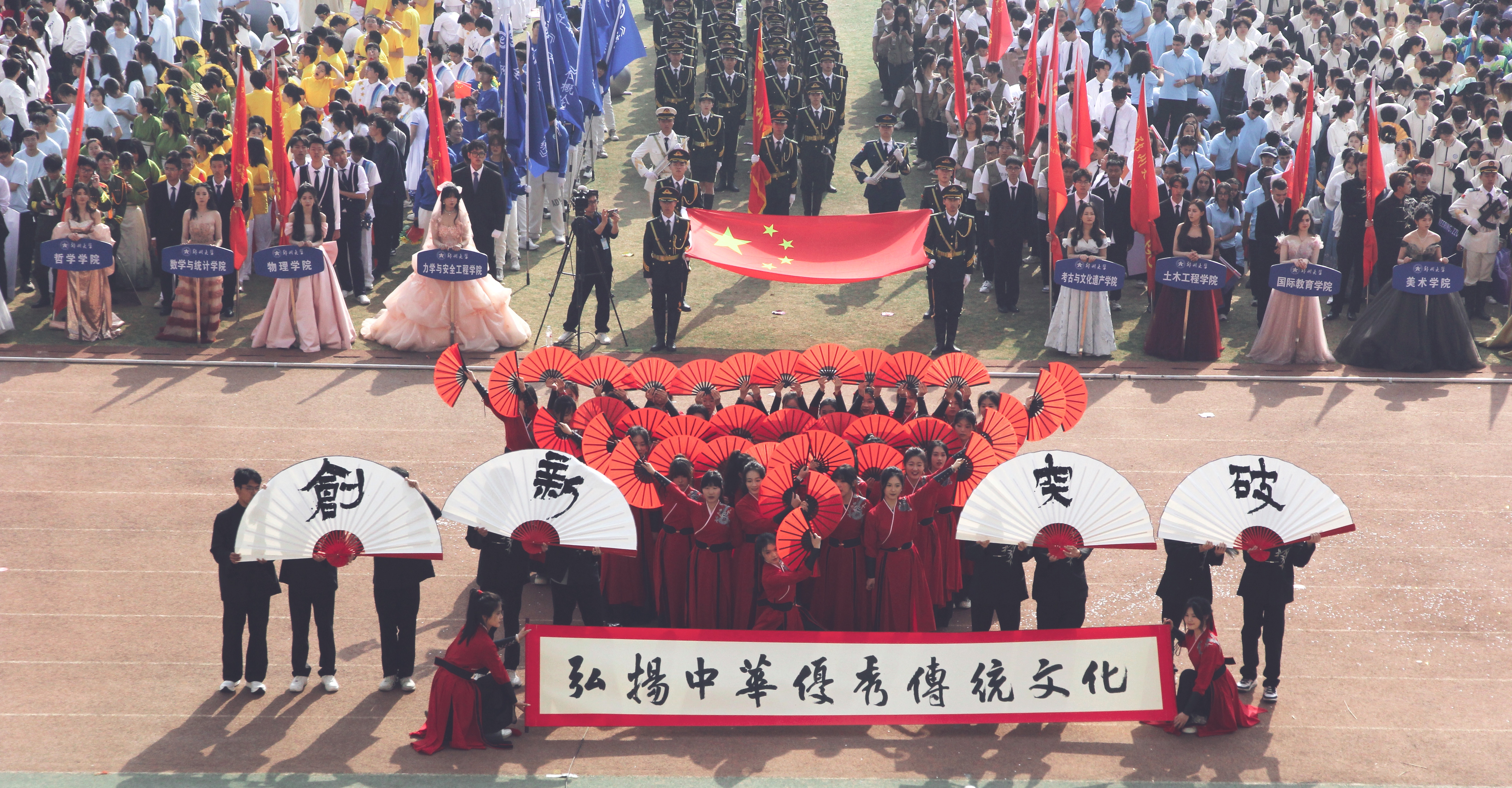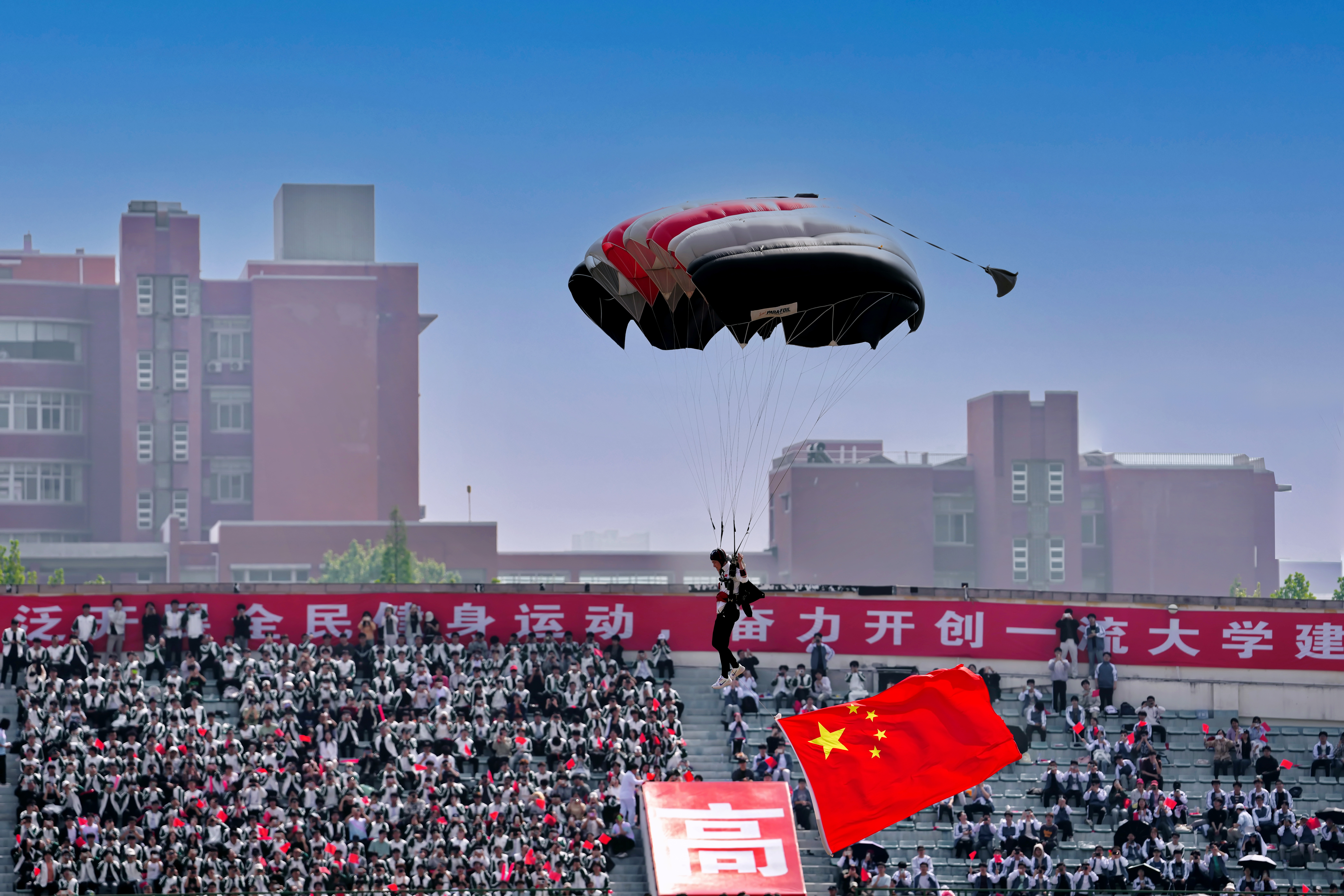 大型开幕式展演拉开帷幕。天空中,河南跳伞队10名队员如雄鹰展翅依次登场,第一组携国旗、校旗凌空招展,第二组拉着彩烟化作“七彩祥云”,第三组身着古装和20米长绸翩然飘落,以震撼方式为展演开场。展演分三个篇章展开。第一篇章《青春跃动・向阳而生》中,1100名操舞运动选修课学生带来团体操“同在红旗下”,以舒展的肢体语言和整齐的动作,诠释着新时代大学生对健康体魄的追求与青春宣言。第二篇章《龙舞千寻・薪火相传》由体育学院近500名学生演绎“龙之舞”,将非物质文化遗产的魅力展现得淋漓尽致,寄寓着“承袭文化之魂,舞出时代新声”的美好愿景。第三篇章《师韵芳华・岁月如歌》中,来自50多个基层工会的800余名女教职工以“时尚养生操”展现师韵芳华,在刚柔并济间将时尚与康养理念巧妙融合,彰显为建设中国特色世界一流大学目标拼搏的巾帼豪情。