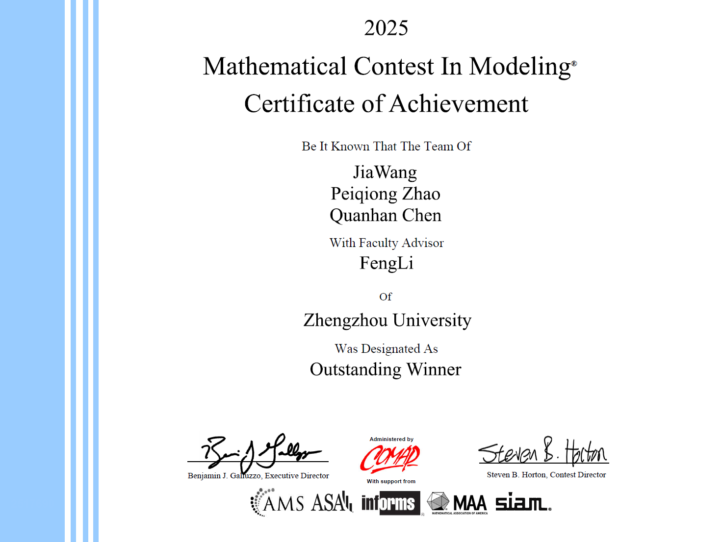 郑大学子荣获美国大学生数学建模竞赛Outstanding Winner奖