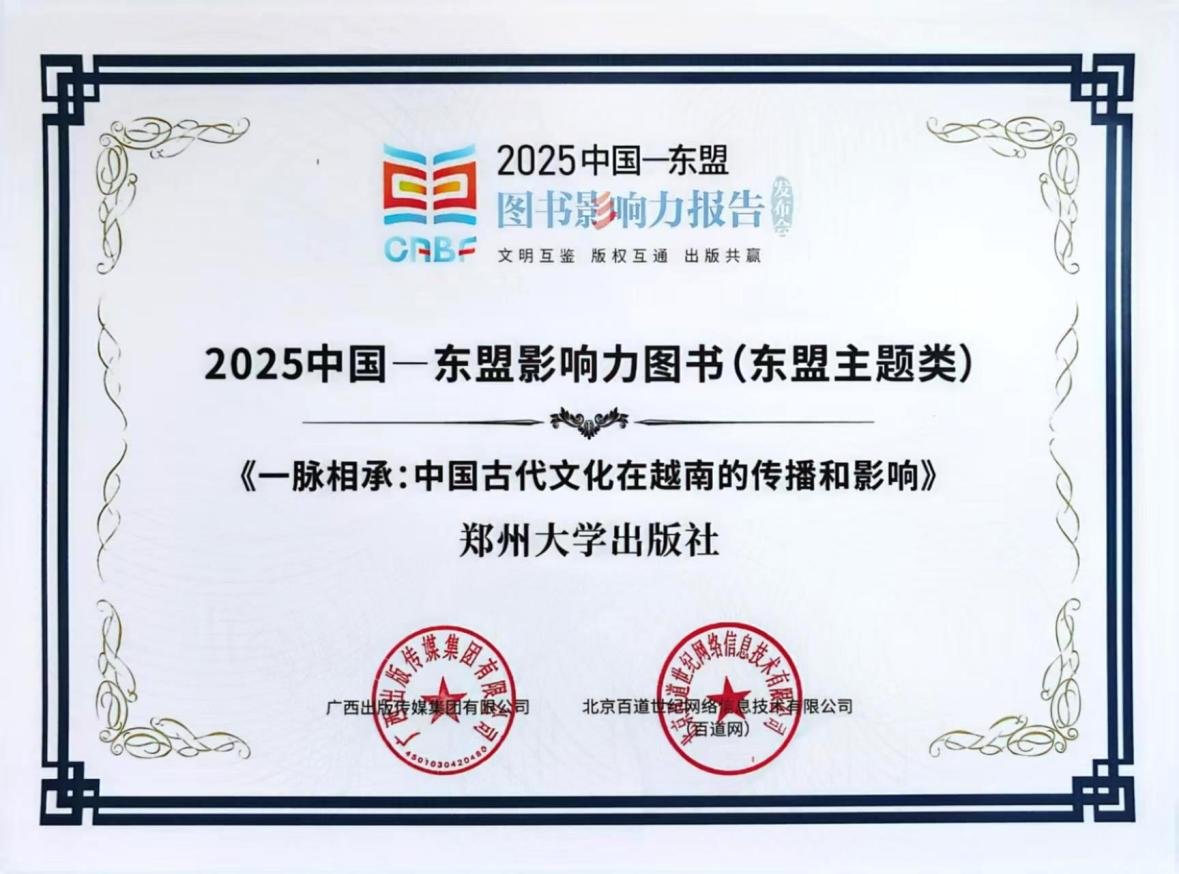 近日,在广西南宁举行的“2025中国—东盟图书影响力报告发布会”上,由德赢AC米兰中国官方网站出版社2022年12月出版的《一脉相承:中国古代文化在越南的传播和影响》上榜“2025中国—东盟影响力图书”。该活动由中国—东盟图书文化周组委会、广西出版传媒集团、百道网联合主办,是“2025中国—东盟图书文化周活动”系列活动之一。其中“东盟主题类”共入选图书15种,我省仅此1种。