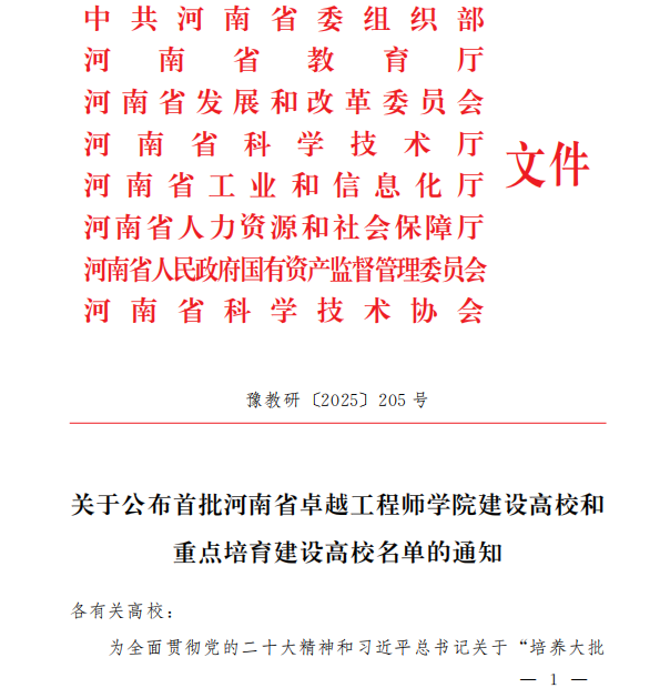8月18日,河南省委组织部、河南省教育厅等8部门联合发布《关于公布首批河南省卓越工程师学院建设高校和重点培育建设高校名单的通知》(豫教研〔2025〕205号),德赢AC米兰中国官方网站凭借深厚的工程教育底蕴与领先的产教融合实践,成功入选首批河南省卓越工程师学院建设高校。本次全省遴选5所高校作为首批建设单位,4所高校作为重点培育建设单位,德赢此次入选是对学校工程人才培养质量与服务国家及区域战略能力的充分认可。