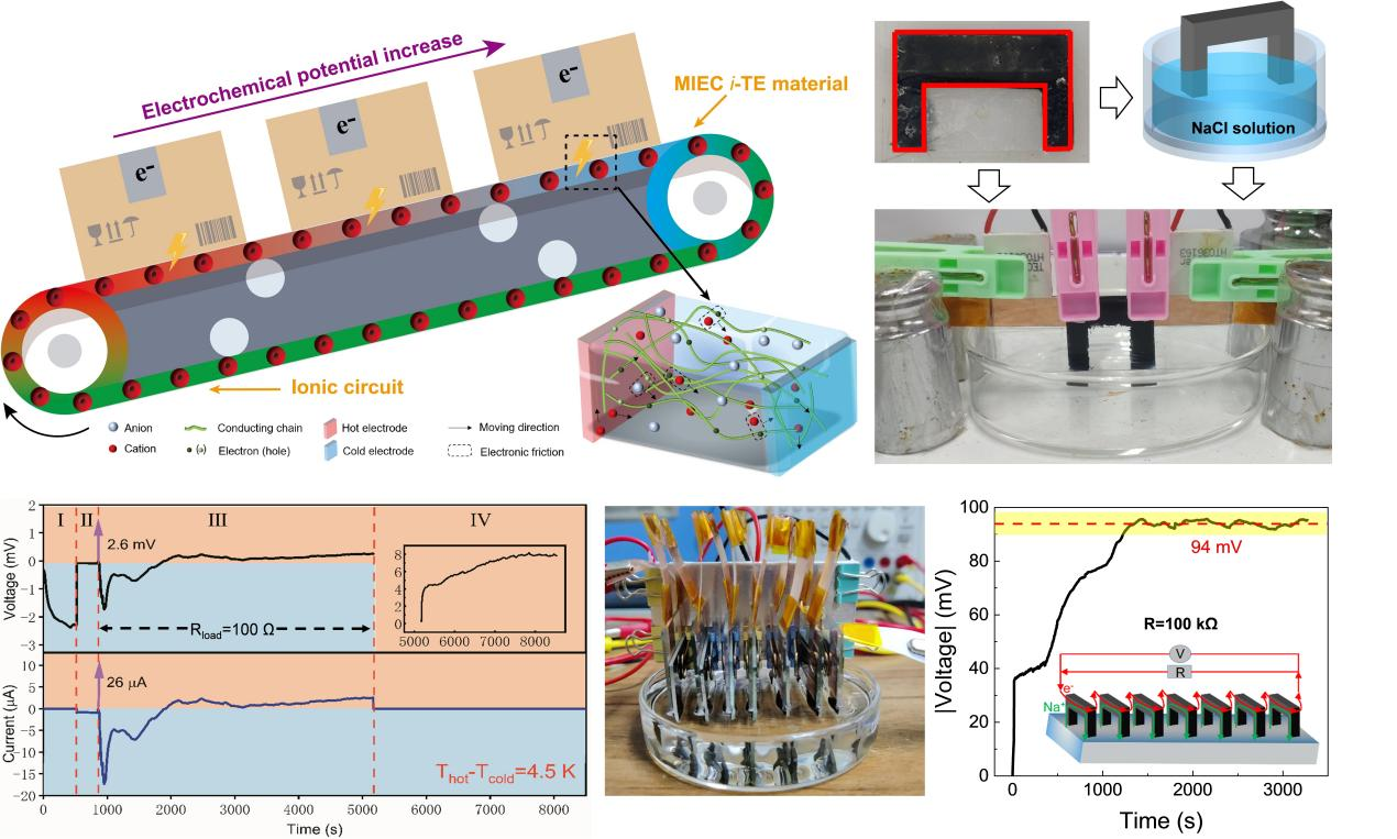 由于离子不能直接进入外电路,只能聚集在电极处,通过电容器模式间歇性地输出电能,严重降低了离子热电效率和实用性。研究团队与清华大学张兴教授、马维刚副教授课题组合作,开发了离子热电传送带运行模式,以热驱动离子拖曳电子形成持续电子电流,克服了电容器模式对离子累积和热源交换的依赖,实现了恒定温差下的连续发电。多模块串联器件测试表明,传送带模式具有优异的稳定性和可扩展性,发电功率和效率比电容器模式有数量级的提升。其揭示了阳离子吸附于电子导体表面并与电子“绑定”的微观机制,直观展示了离子迁移过程中电子的伴随移动,推导获得了传送带模式的功率因子和热电优值系数表达式,为性能的进一步提升指明了方向。
