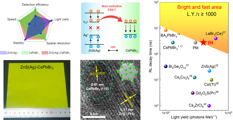 针对CsPbBr3QDs闪烁体光产额低、制备工艺兼容性差的问题,德赢AC米兰中国官方网站杨智、宋继中等设计了一种多位点ZnS(Ag)-CsPbBr3异质结,提出了原位固相合成策略制备异质结闪烁体。基于光谱匹配和短D-A距离特性,通过稳态RL光谱进化,瞬态吸收和瞬态PL谱证明了ZnS(Ag)给体到CsPbBr3受体发生了高效的福斯特共振能量转移(FRET),使得异质结闪烁体获得了光产额40,000 photons/ MeV,明显高于直接物理混合闪烁体的30,000 photons/MeV,证明了FRET导致的辐射增强可以在一定程度上弥补自吸收光损失。同时异质结闪烁体具有36 ns的快发光衰减时间和高的空间分辨率30 lp/mm。基于高光产额、快发光和高分辨成像的优势,异质结闪烁体展示了优异的高速动态X-ray成像性能,模拟了医学高速血管造影,在200帧/秒的速度和10 mGyairs−1剂量率下观察到11 cm/s的碘对比剂液流速度。该工作为设计和制造高性能异质闪烁体提供了新的方案,展示了兼具快和亮的闪烁体在实时X射线成像中的重要作用。
