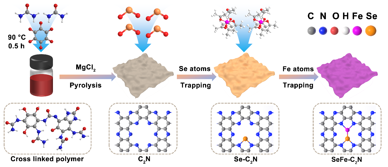 由于具有协同作用,双原子催化剂(DACs)因其明确定义的活性位点而受到广泛关注。然而,为了进一步构建明确的双原子位点并理解其在多步骤催化反应中的协同作用,仍需进行更多的实验研究和理论分析。为此,研究团队精确设计了一系列基于硒的不对称双原子催化剂,包括异核SeN2–MN2(M=Fe、Mn、Co、Ni、Cu、Mo等)活性位点,以提高氧还原反应(ORR)的效率。在这些设计的基于硒的双原子催化剂中,硒-铁双原子催化剂在碱性ORR中表现出优异的性能,其半波电位达到0.926 V(相对于可逆氢电极)。此外,基于SeN2–FeN2的锌-空气电池具有高比容量(764.8 mAh g−1)和最大功率密度(287.2 mW cm−2)。光谱表征和理论计算表明,异核硒原子通过短程调节有效极化了其他金属原子的电荷分布。此外,与单原子位点Se或Fe相比,SeFe双原子位点通过*O中间体的共吸附,显著降低了从*O到*OH的转换能量障碍。本研究为设计异核双原子催化剂以提高ORR效率提供了新的视角。