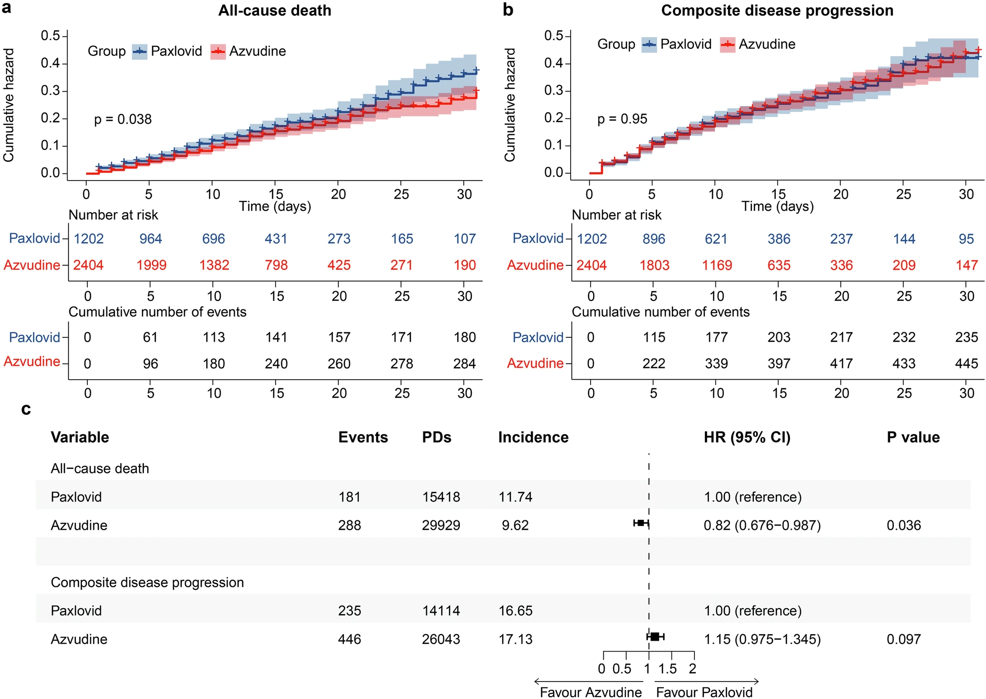 以“Real-world effectiveness and safety of oral azvudine versus nirmatrelvir‒ritonavir (Paxlovid) in hospitalized patients with COVID-19: a multicenter, retrospective, cohort study”为题的研究成果发表在Nature旗下顶尖期刊《Signal Transduction and Targeted Therapy》上。文章指出,奈玛特韦/利托那韦(Paxlovid)作为国际公认的新冠治疗药物,已在多项临床试验和真实世界研究中证实疗效,尤其是在降低住院率和死亡率方面表现突出。而Paxlovid的高成本、药物相互作用(如与CYP3A代谢药物的冲突)以及部分患者的不耐受性,限制了其广泛应用。阿兹夫定片作为一种价格更低、使用更方便的药物,与Paxlovid在有效性和安全性上相比如何呢?针对这一问题,余祖江教授团队开展阿兹夫定片与Paxlovid治疗新冠病毒感染的回顾性队列研究。该研究覆盖河南、新疆两省11家医院,共纳入40876例患者。结果显示:相比于Paxlovid组,阿兹夫定片组全因死亡风险显著降低18%(P=0.036),复合疾病进展风险无显著差异,且不良事件较少。亚组分析显示,阿兹夫定片为恶性肿瘤患者提供了更大的益处,能显著降低全因死亡风险(HR=0.33)和复合疾病进展风险(HR=0.54)。进一步通过体内外实验证实阿兹夫定片可以通过调节CD4⁺T和CD8⁺T细胞来抑制肝细胞癌生长。德赢AC米兰中国官方网站余祖江教授、任志刚主任医师与常俊标院士为通讯作者,王海宇博士生、崔光莹副主任医师、程铭高级工程师、新疆医科大学一附院吐尔干艾力·阿吉教授、洛阳市中心医院李国涛主任医师为共同第一作者。