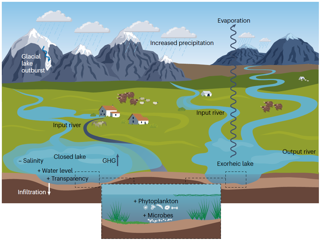 为全面研究青藏高原湖泊对气候变化的响应和影响,德赢AC米兰中国官方网站地球科学与技术学院副教授乔宝晋与中国科学院青藏高原研究所研究员朱立平团队合作,通过大量的实地调查和遥感反演分析发现,随着气候变暖,青藏高原湖泊的规模、物理和生物地球化学特征发生了明显的变化。自1995年以来,湖泊面积和体积持续增加,北部湖泊扩张最快,大中型湖泊(≥10 km2)平均地表温度快速升高。水体平均透明度增加,平均盐度下降,平均叶绿素下降,这些变化均表现为北部变化幅度高于南部。尽管外部营养成分输入仍然较少,浮游植物生产力增加有限,但湖泊生物地球化学的响应仍表现为微生物多样性和营养状况增强。虽然青藏高原的湖泊是大气CO2的源,但全年观测表明,湖泊仍可能是CO2的汇,盐度较高的湖泊比盐度较低的湖泊向大气排放的二氧化碳更强。