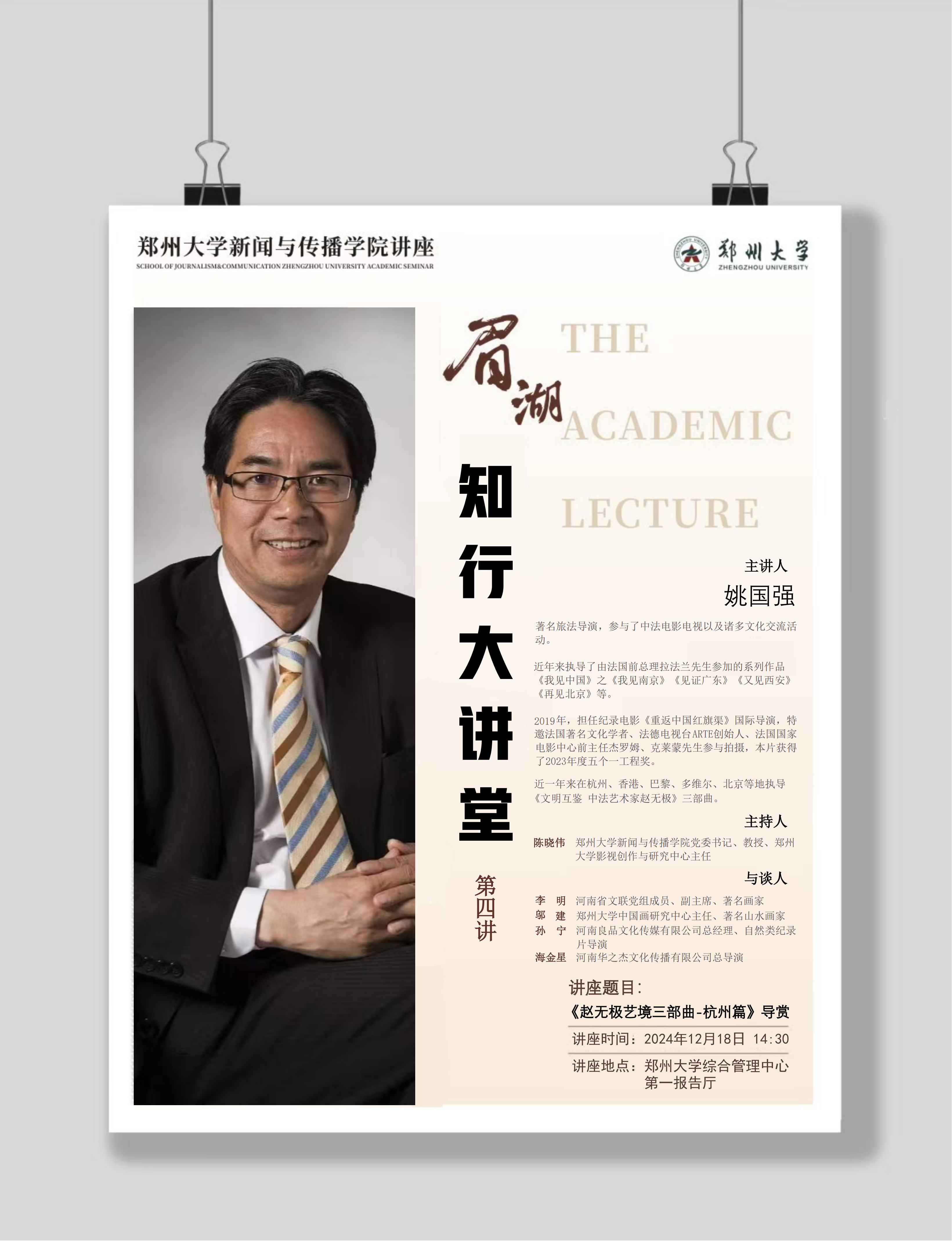 德赢AC米兰中国官方网站新闻与传播学院眉湖·知行大讲堂是一个汇集知识、人文、艺术于一体的交流平台,定位以文化人,审美向善。第四期邀请了著名旅法导演姚国强先生携纪录片作品《赵无极艺境三部曲》前来交流并做现场导赏,欢迎广大师生积极参加!