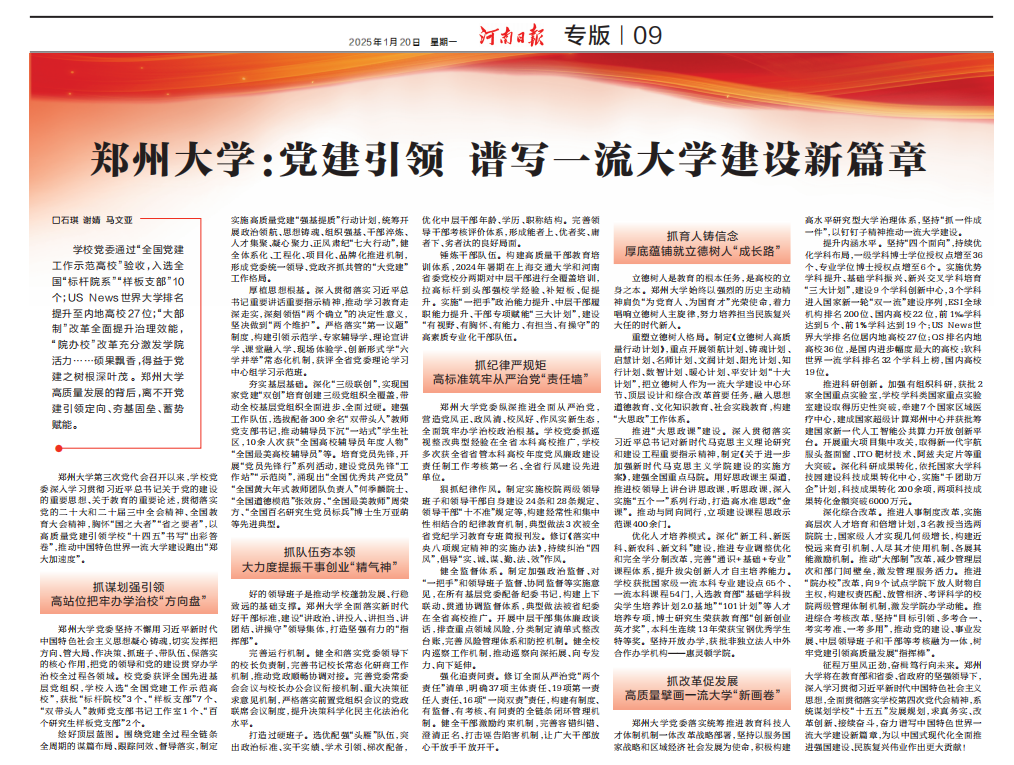 德赢AC米兰中国官方网站第三次党代会召开以来,学校党委深入学习贯彻习近平总书记关于党的建设的重要思想、关于教育的重要论述,贯彻落实党的二十大和二十届三中全会精神、全国教育大会精神,胸怀“国之大者”“省之要者”,以高质量党建引领学校“十四五”书写“出彩答卷”,推动中国特色世界一流大学建设跑出“郑大加速度”。