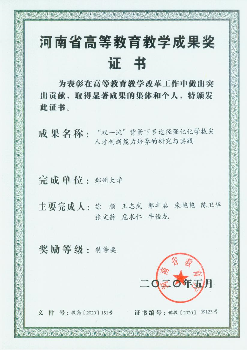 “双一流”建设以来,化学学院获批国家级实验教学示范中心、高等学校学科创新引智基地、河南省绿色催化加氢重点实验室、河南省绿色增塑剂工程研究中心等国家级和省部级科研平台,为创新人才培养提供了条件和支撑。