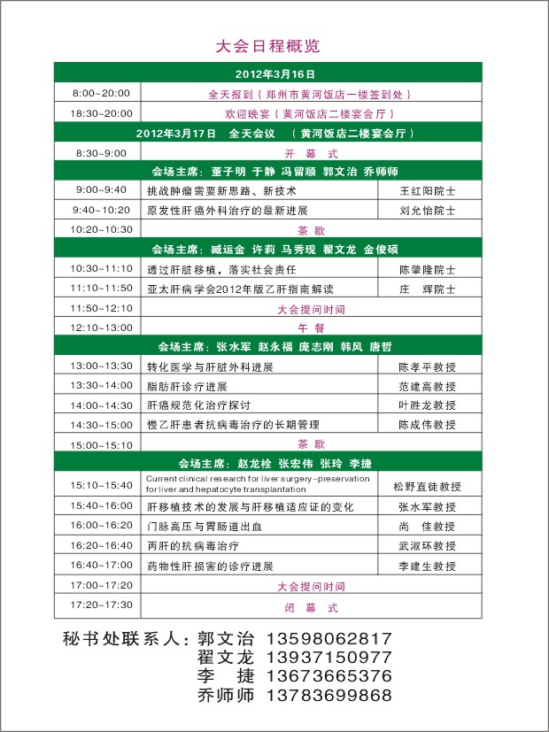 兹定于2012年3月16-17日在郑州黄河饭店召开,大会邀请到王红阳院士、刘允怡院士、陈肇隆院士、庄辉院士、陈孝平教授、叶胜龙教授、范建高教授、陈成伟教授、松野直徒教授及国内外知名专家,就肝病基础与临床研究的前沿与热点问题及肝脏外科、肝炎、肝移植、脂肪肝、转化医学等专题作精彩演讲。