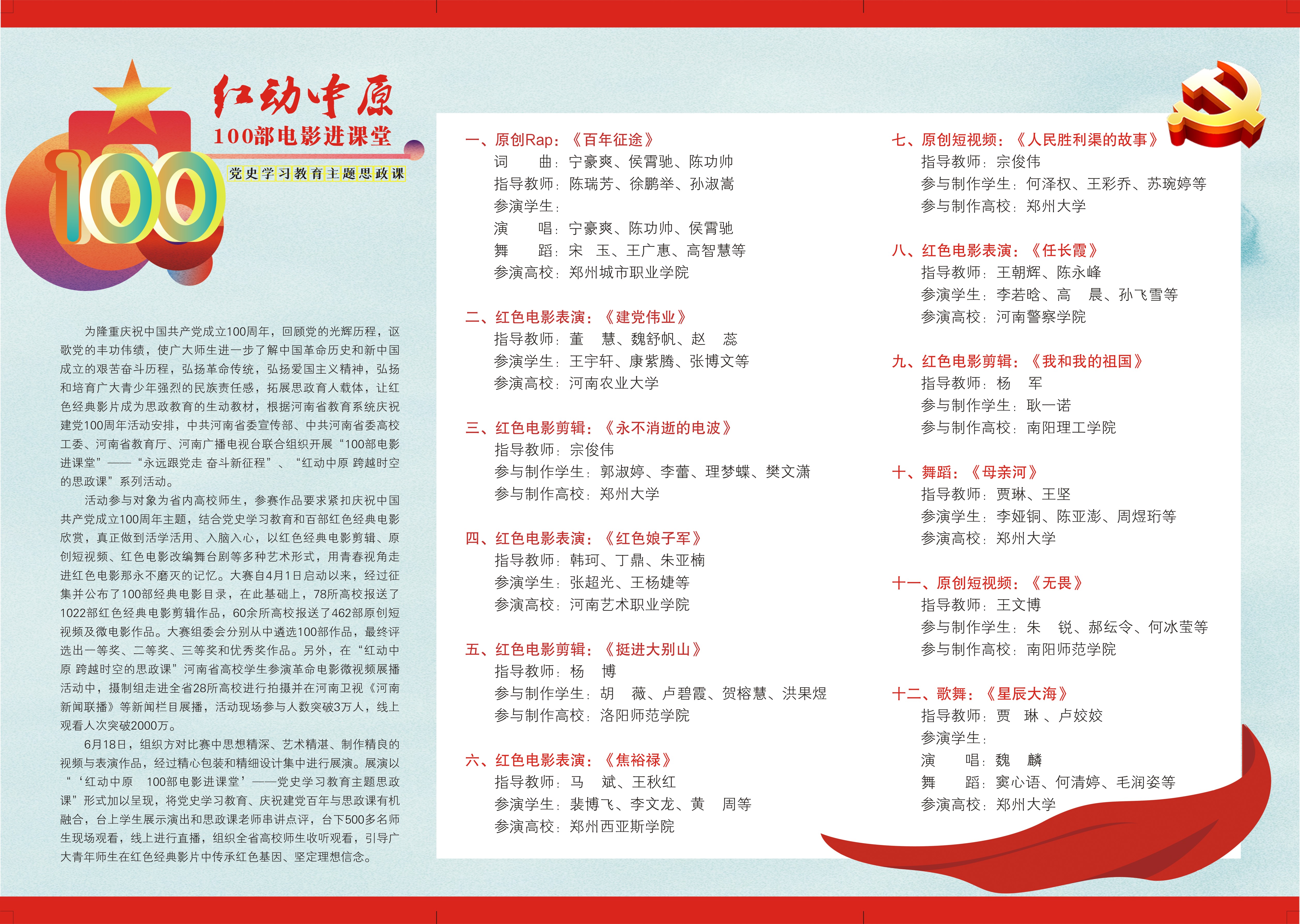 为庆祝中国共产党成立100周年,推动党史学习教育入脑入心,拓展思政育人载体,由省委宣传部、省委高校工委、省教育厅、河南广播电视台主办,德赢AC米兰中国官方网站等单位承办的“红动中原·100部电影进课堂”党史学习教育主题思政课将于今晚(6月18日)19:00-21:00在南校区学习堂举行。